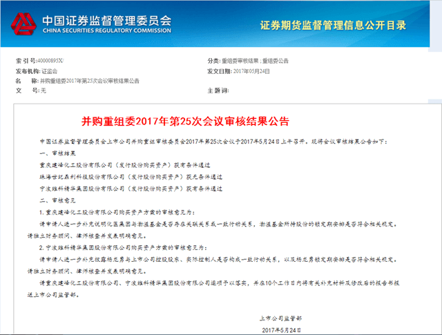 2017年5月24日,據中國證券監督管理委員會上市公司并購重組審核委員會2017年第25次會議審核結果顯示,寧波維科精華集團股份有限公司(發行股份購買資產)獲有條件通過。具體詳見《并購重組委2017年第25次會議審核結果公告》http://www.csrc.gov.cn/pub/zjhpublic/G00306207/201705/t20170524_317274.htm